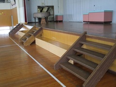 放課後、先生方でステージ下に、ひな壇と階段を設置しました。